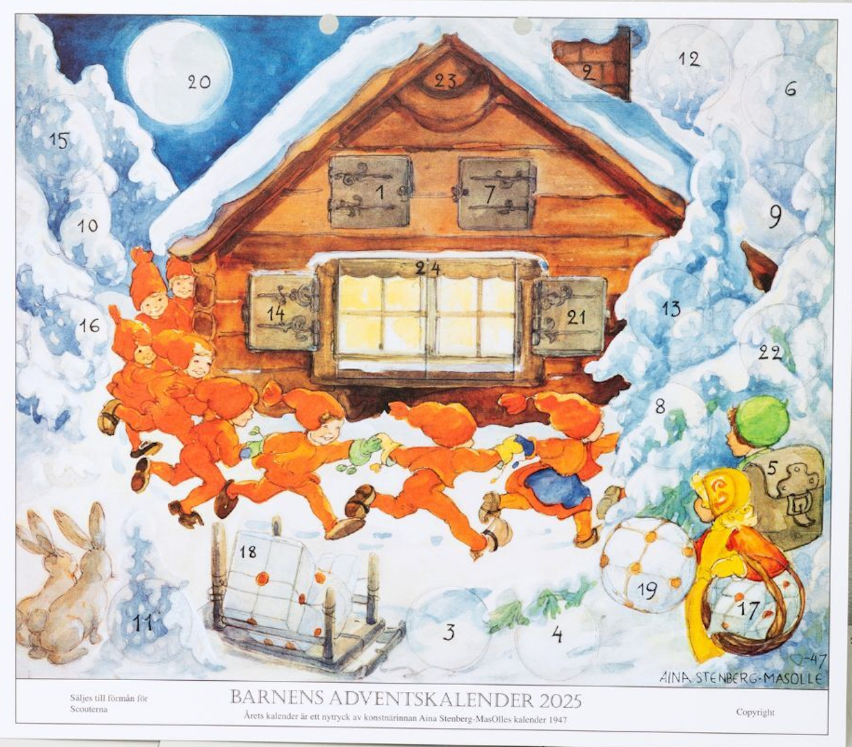 Den första tryckta svenska adventskalendern gavs ut av Scouterna, redan 1934. Sagoboksillustratören Aina Stenberg-MasOlle fick uppdraget att ta fram motivet till kalendrarna från starten till 1964 och namnet blev Barnens adventskalender. Nu återpubliceras de olika motiven och årets adventskalender är ett nytryck från 1947 års upplaga.