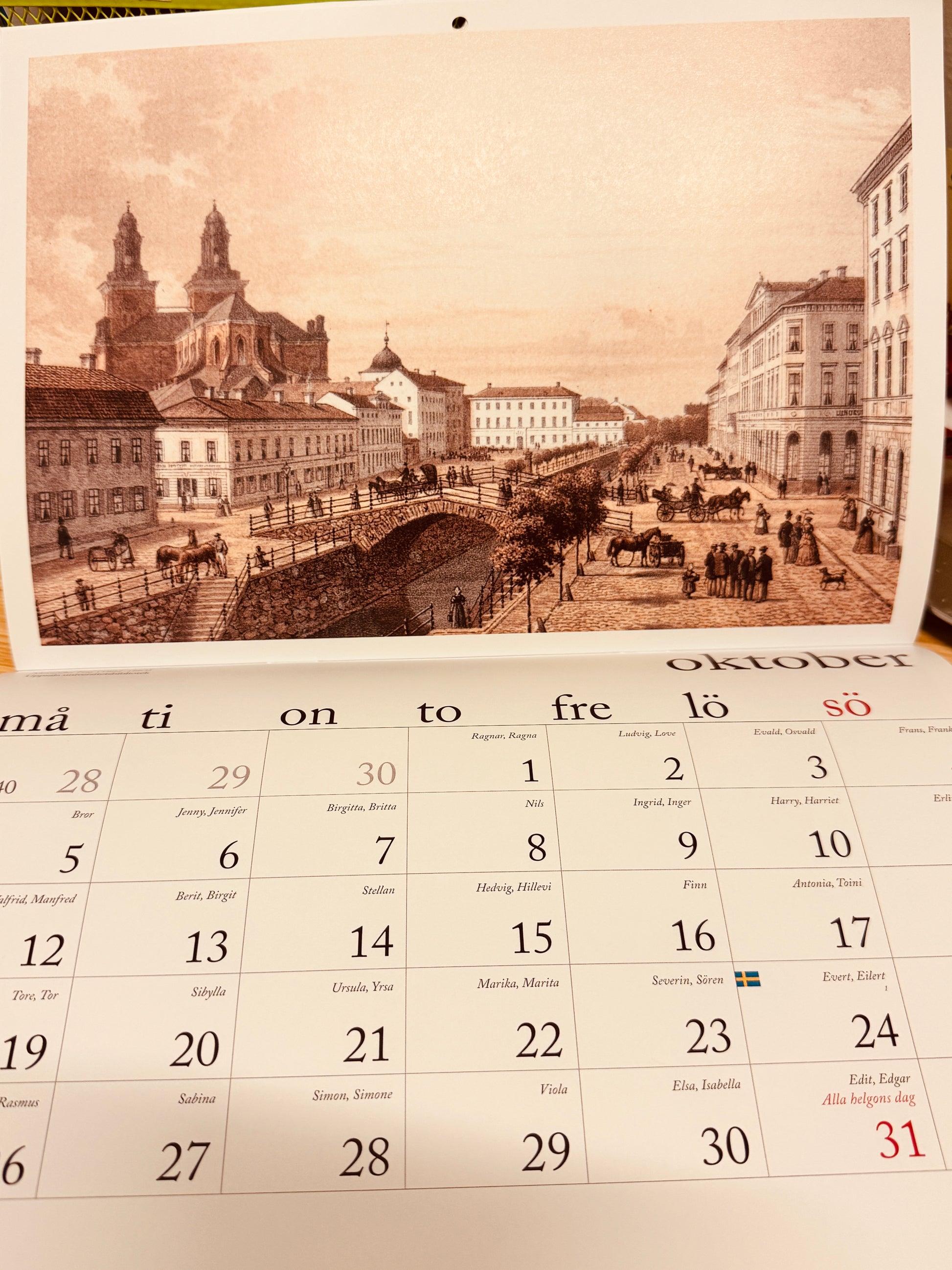 En väggkalender med vackra vyer från Uppsala från 1800-talet. Litografier från äldre verk hämtade från Uppsala universitetsbiblioteks samlingar.